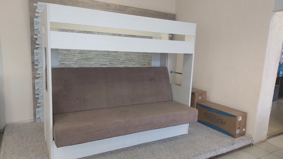 Кровать детская двухъярусная Карамель 75 Дуб Сонома, диван - велюр Савана (сборка на любую сторону) спальное место верх 80х190, низ 120х185