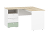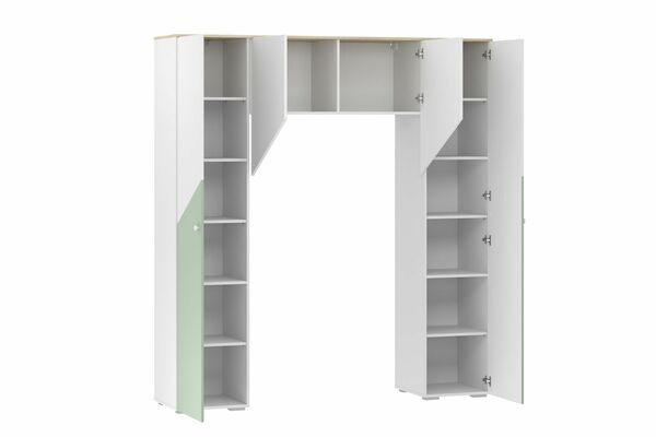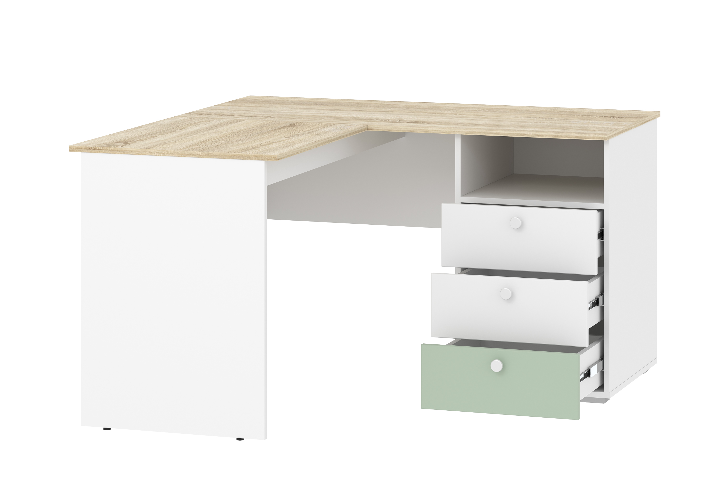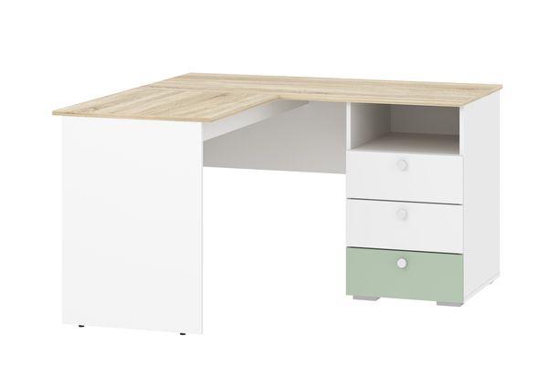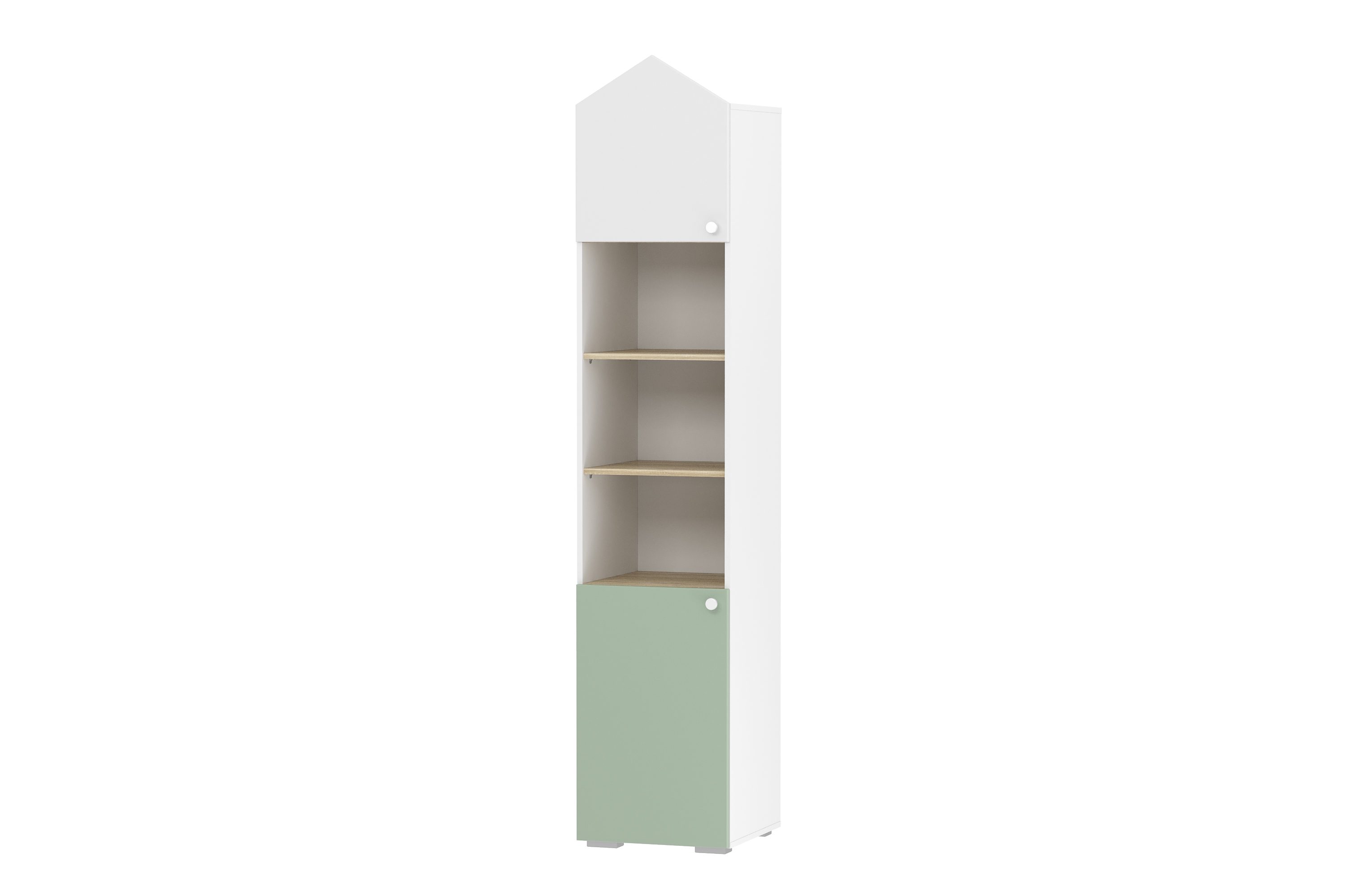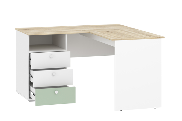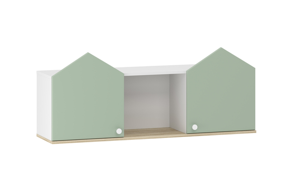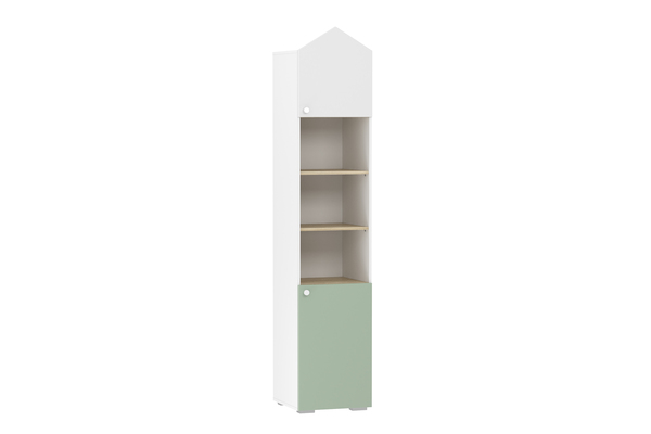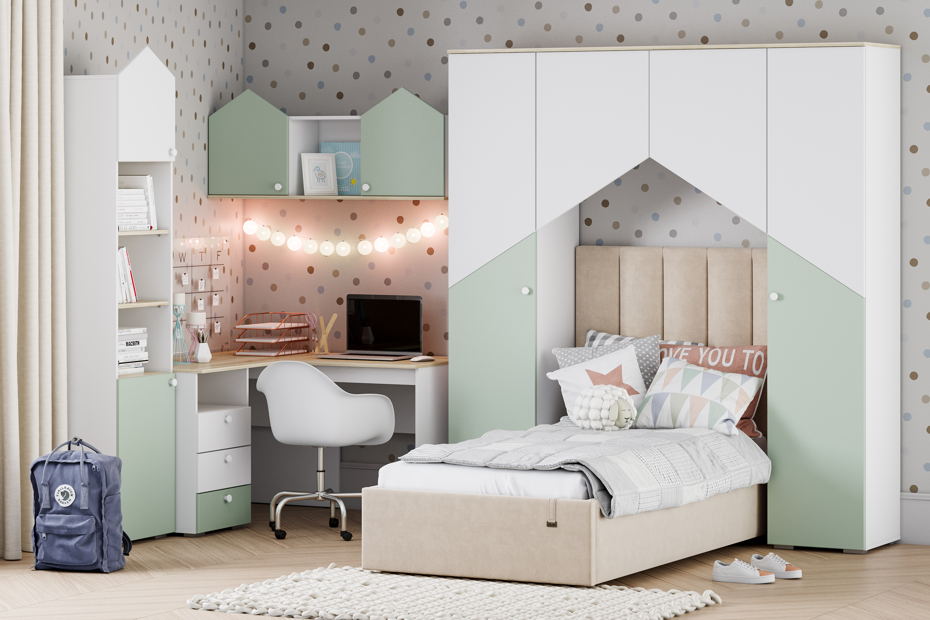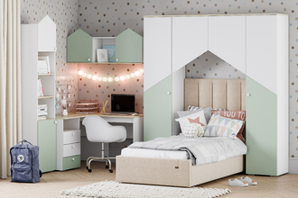 Оригинальный дизайн в виде домиков придаст интерьеру уникальность. Скругленные ручки на ящиках и дверцах делают мебель безопасной для детей. Открытые полки шкафа-пенала позволят расставить на видных местах игрушки, сувениры, книги и украсить комнату, как нравится ребенку. Угловой письменный стол поможет комфортно делать домашнее задание, рисовать. Фасады выполнены из МДФ с покрытием ПВХ.