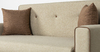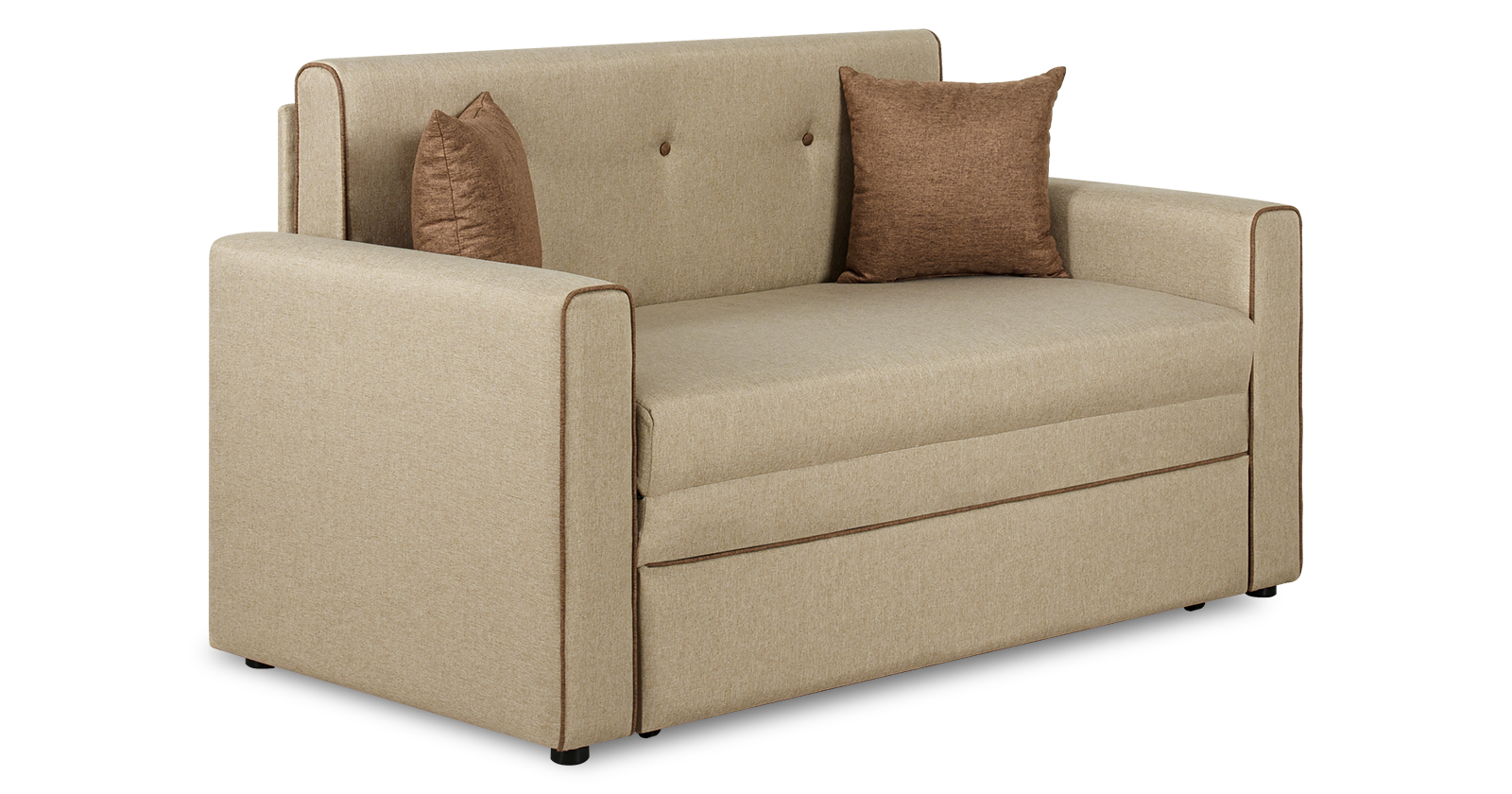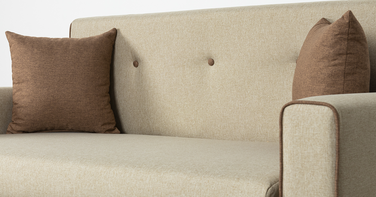 Декоративный контрастный кант по торцу спинки, торцу подлокотника, по верхнему срезу царги. Утяжки с пуговицами на спинке дивана. Две декоративные подушки в контрастной ткани.
