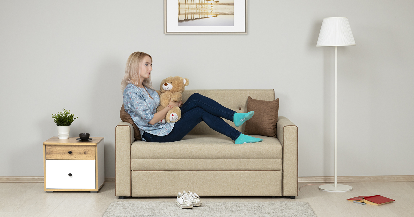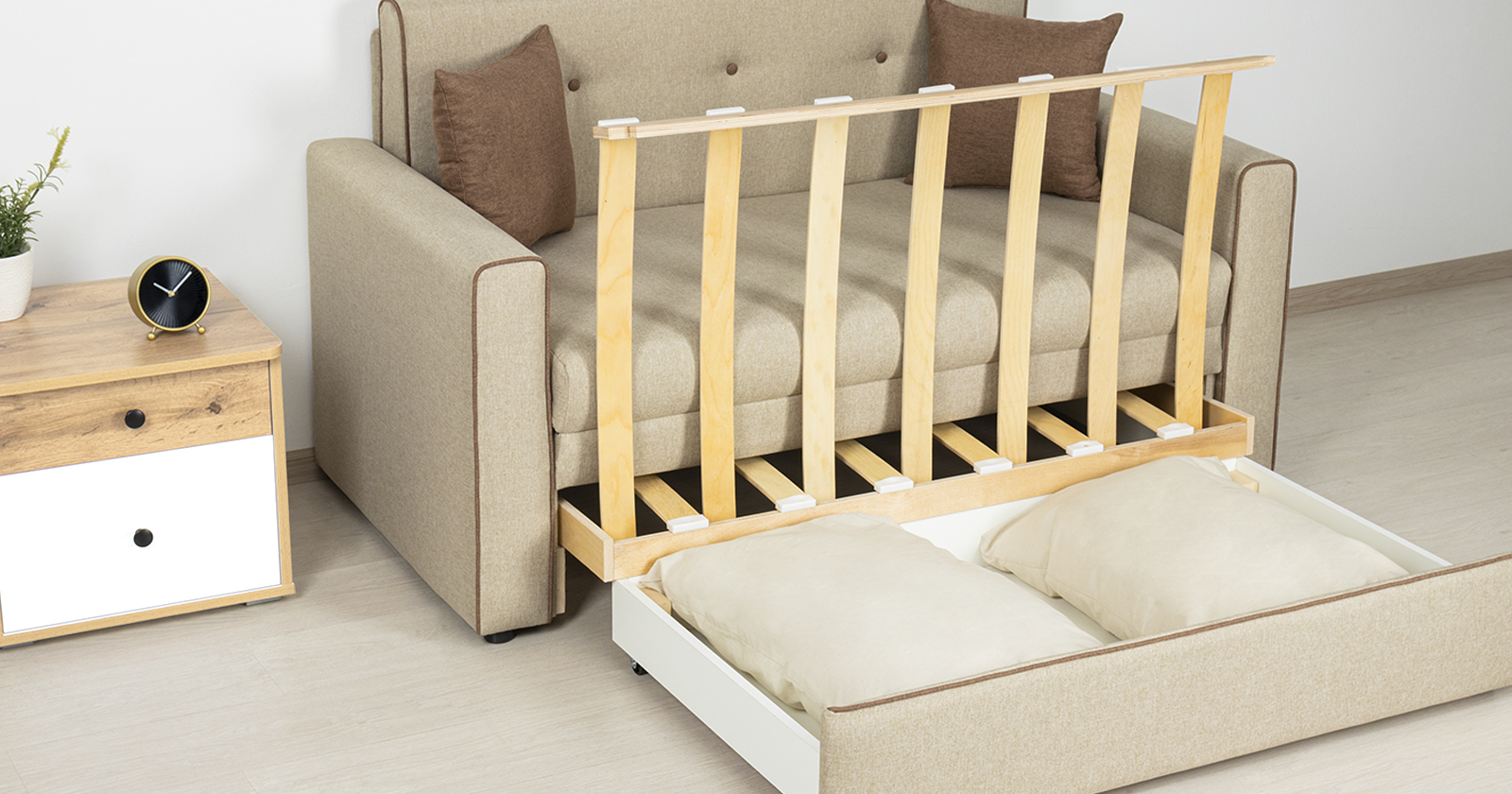 Диван-кровать Найс - компактное современное решение для гостиных, квартир-студий, детских и подростковых комнат. Может использоваться в качестве постоянного спального места для детей и подростков или гостевого спального места взрослого.