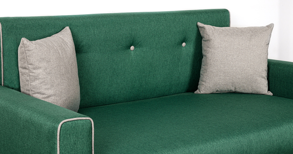 Декоративный контрастный кант по торцу спинки, торцу подлокотника, по верхнему срезу царги. Утяжки с пуговицами на спинке дивана. Две декоративные подушки в контрастной ткани.