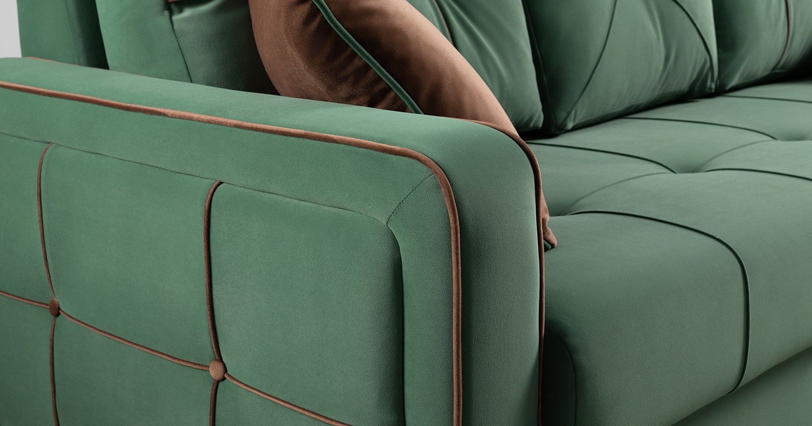 Декоративные канты на подушках и вставке подлокотников. Пуговицы в местах пересечения кантов на подушке и вставке подлокотников. По торцам подлокотников и думках контрастный декоративный кант. Защипы на сиденье и средней большой подушке.