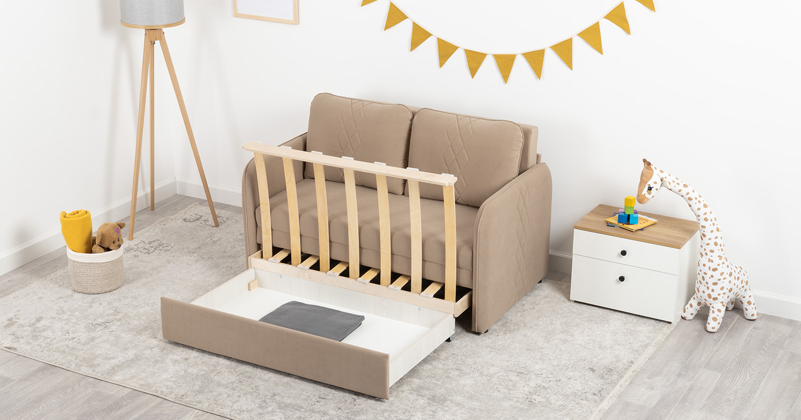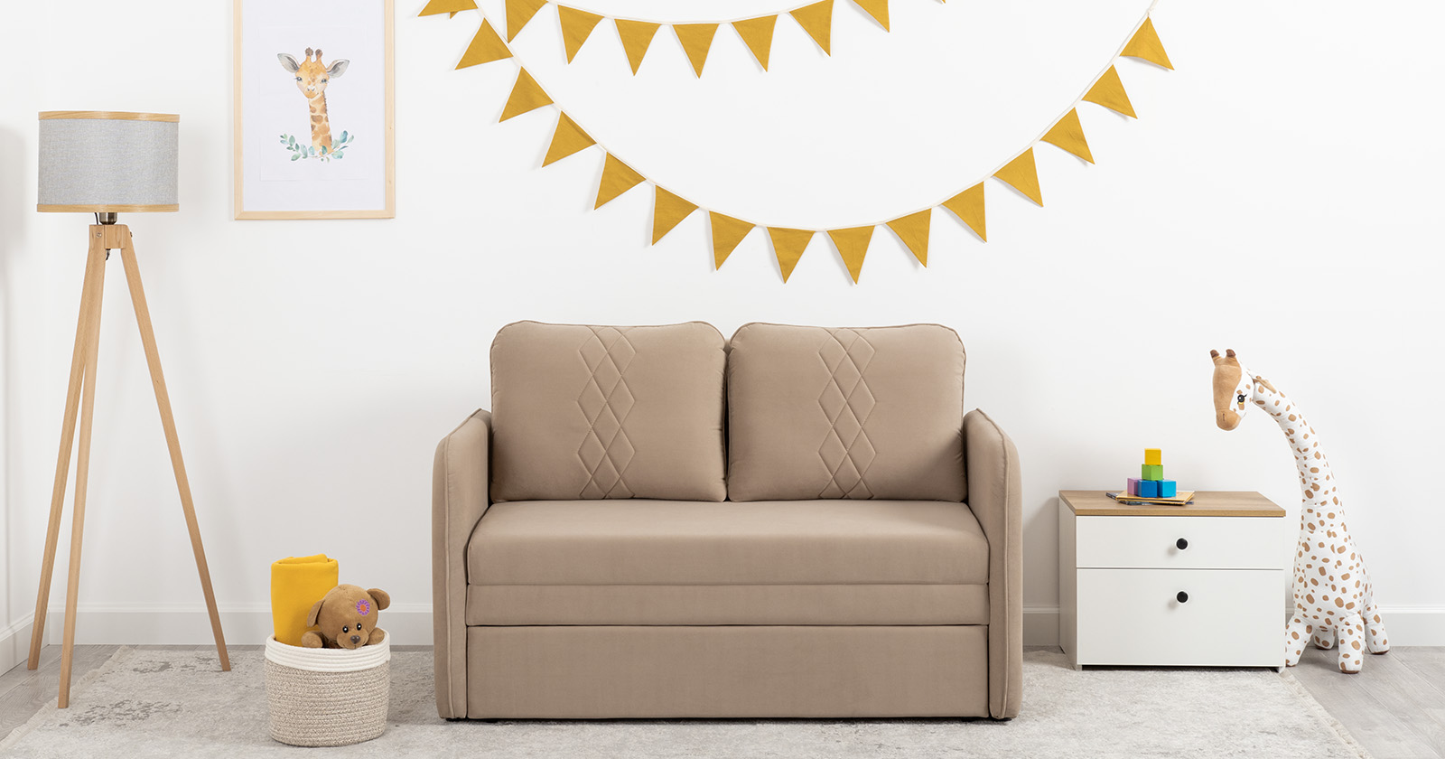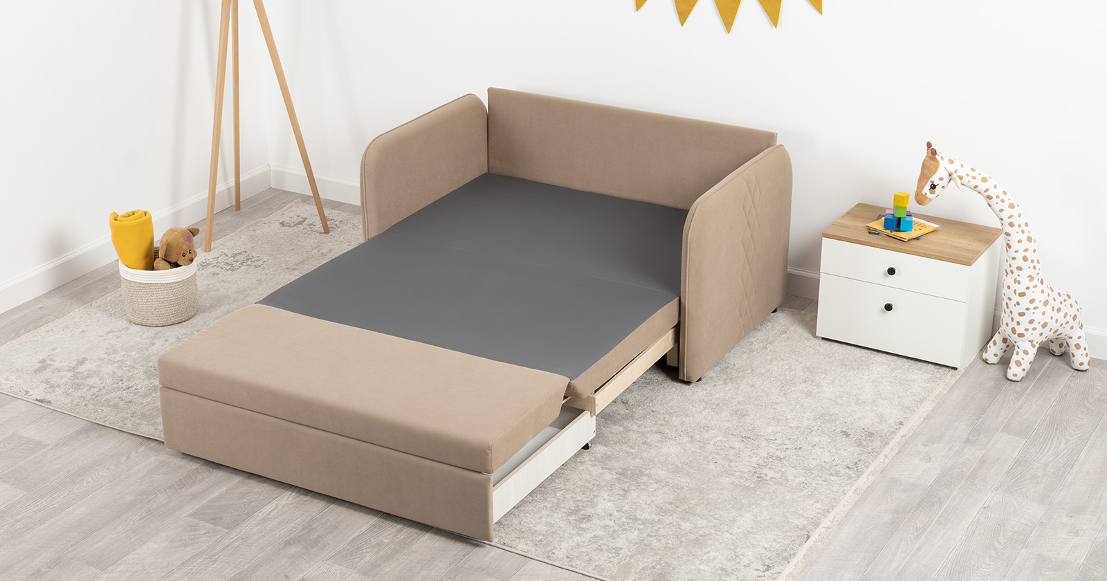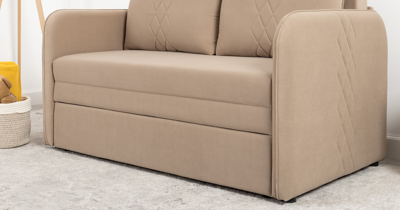 Стильный компактный диван для детской и гостиной. При своих скромных размерах он трансформируется в полноценное спальное место для детей и подростков. Лаконичный дизайн в виде декоративной стежки подчеркивает фактуру велюра, а небольшие размеры позволят разместить его в любом пространстве.
