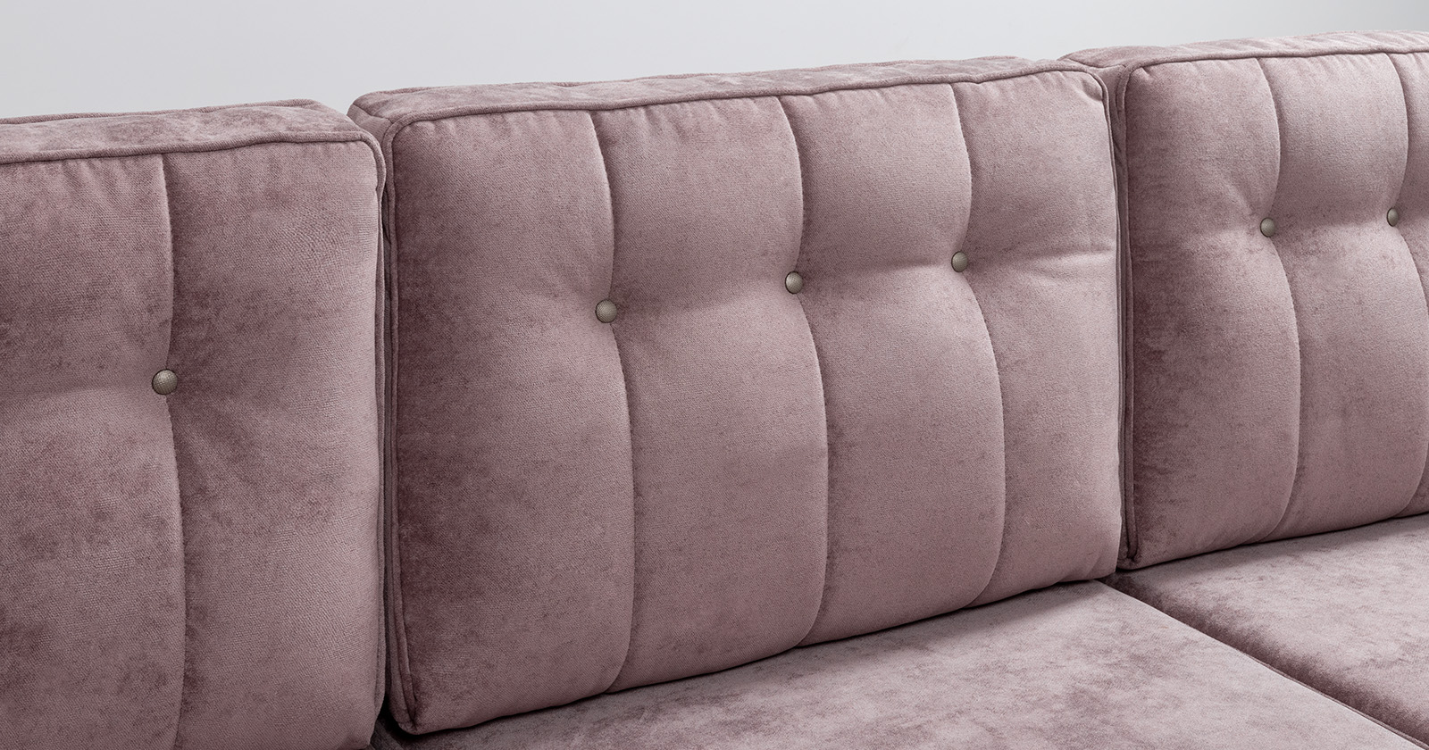 Подушки имеют трапециевидную форму, с утолщением к низу для комфорта посадки. Кант по всему периметру подушек, декоративные утяжки металлическими пуговицами, вертикальная стежка.