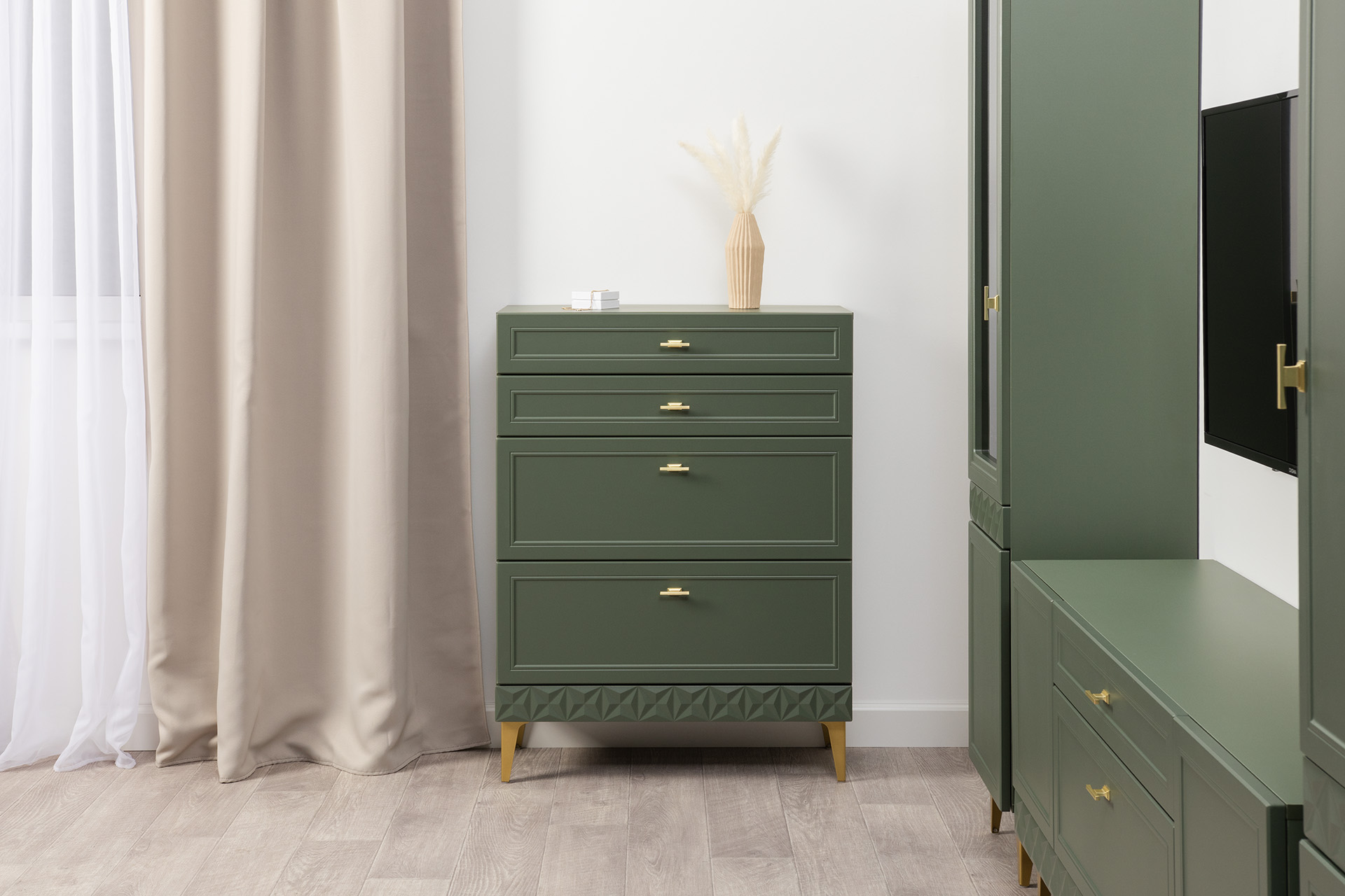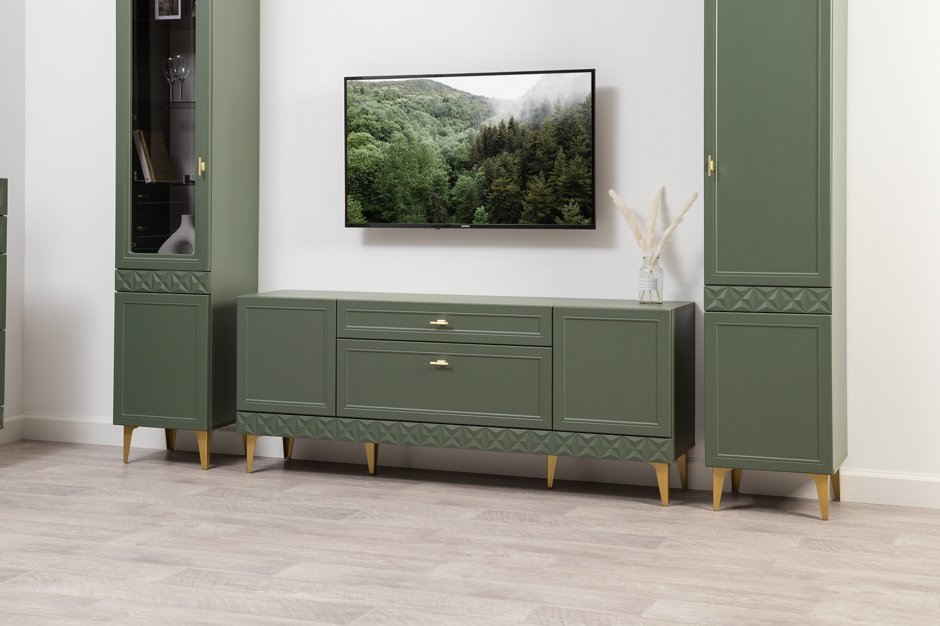 Гостиная Марион композиция 1 дымчатый зеленый K521, олива шагрень AG 1050 ПВХ, белый PE шагрень (собирается на любую сторону)