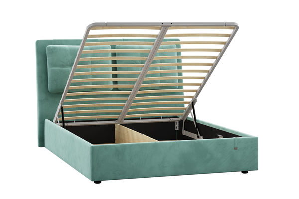 Подъемный механизм легок в управлении, а вместительный короб внутри кровати подойдет для хранения подушек, белья и других вещей.