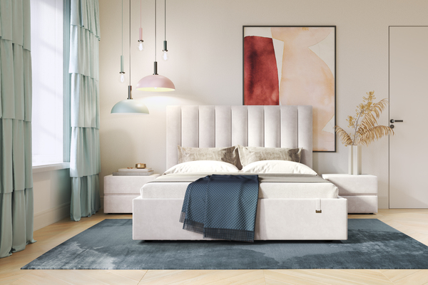 Кровать «Ingrid»  подойдет для современных интерьеров спален, впишется в стиль ретро и скандинавский минимализм. Обивка будет отлично сочетаться с любыми цветовыми оттенками отделки и мебели. Кровати выполнены в нейтральных и ярких тканях велюр, что позволяет подобрать подходящий вариант почти под любой интерьер. Изголовье имеет прямоугольную форму, повторяя очертания кровати. Дизайн модели отличается высоким изголовьем с вертикальными строчками и углублениями.