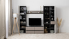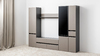 Акцентом выступают чёрные горизонтальные вставки и тонированное стекло витрины. Чёрная задняя стенка эффектно подчеркивает наполнение шкафов.
