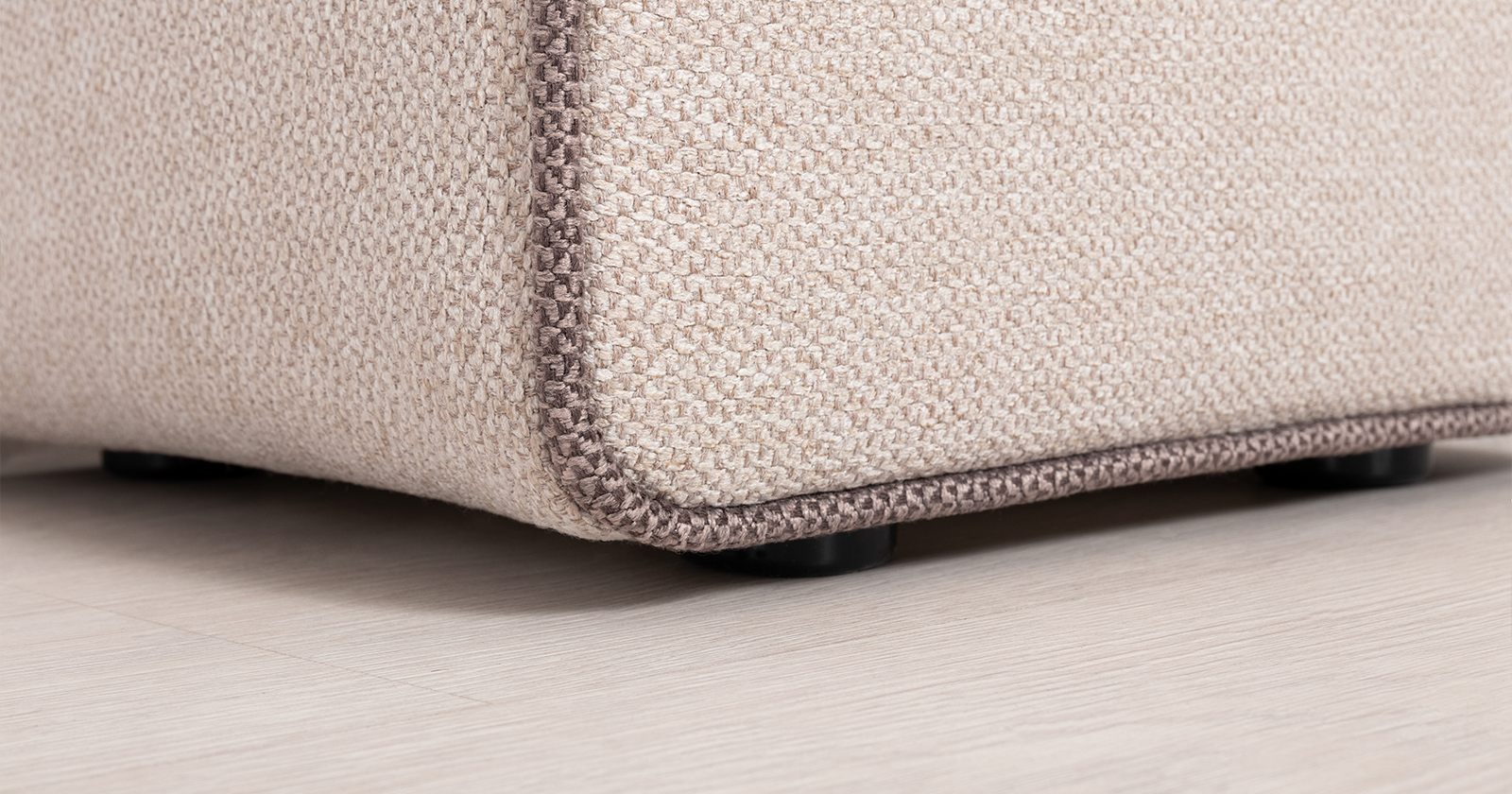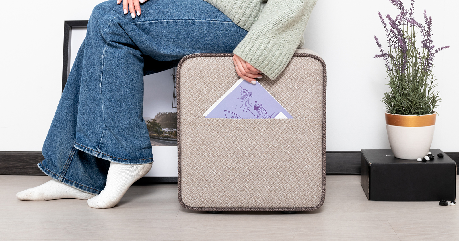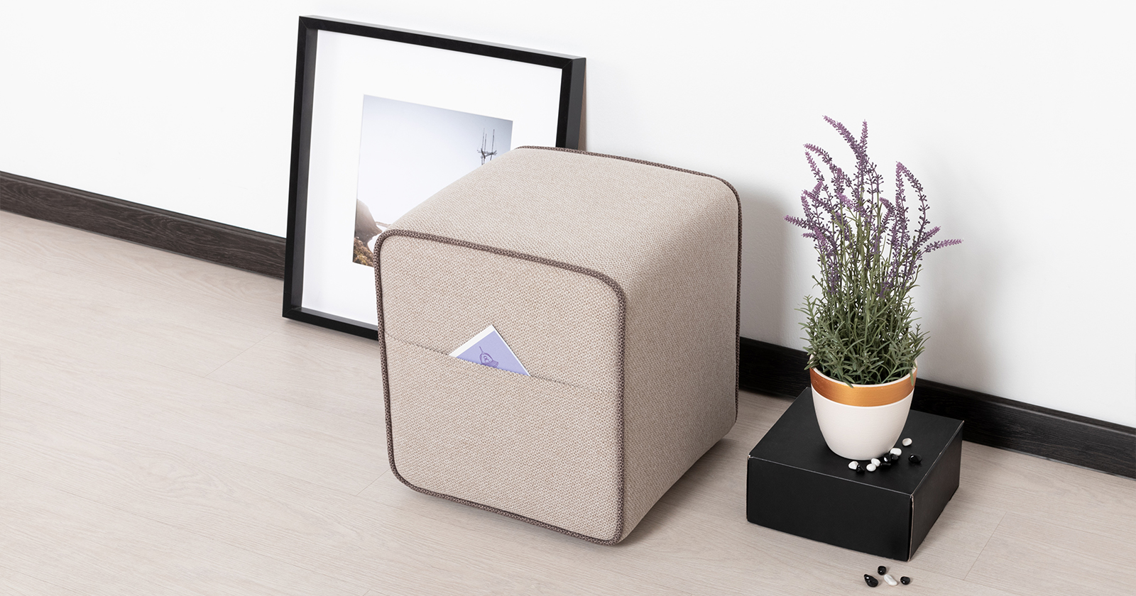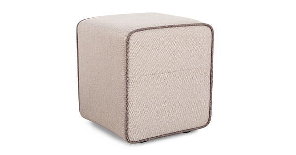 Боковые карманы на противоположных сторонах пуфа, два противоположных торца оформлены контрастным кантом