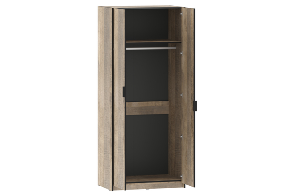 Габаритные размеры (ШхГхВ): 93,2 х 59 х 220,4. Предназначен для хранения одежды, навешанной на плечики, а также в сложенном состоянии на его внутренних полках. Представляет собой каркас из панелей ЛДСП со стяжной горизонтальной панелью. В отделении за двумя распашными дверями полка для одежды и овальная штанга. Шкаф может комплектоваться как двумя дверями ЛДСП, так и сочетанием одной дверью ЛДСП и одной дверью ЛДСП с наклеенным зеркалом. Изделие стандартной сборки. Фурнитура: - Опора наконечник черный, - Петля вкладная 90 с доводчиком Boyard (H302C02/2410), - Ручка СА-1 96 Алди черный. В качестве крепежа используются шканты и эксцентриковые стяжки. Все видимые отверстия закрываются заглушками в цвет корпуса. Шкаф укомплектован двумя уголками Овербаланс для крепления к стене и двумя межсекционными стяжками для соединения в композицию.