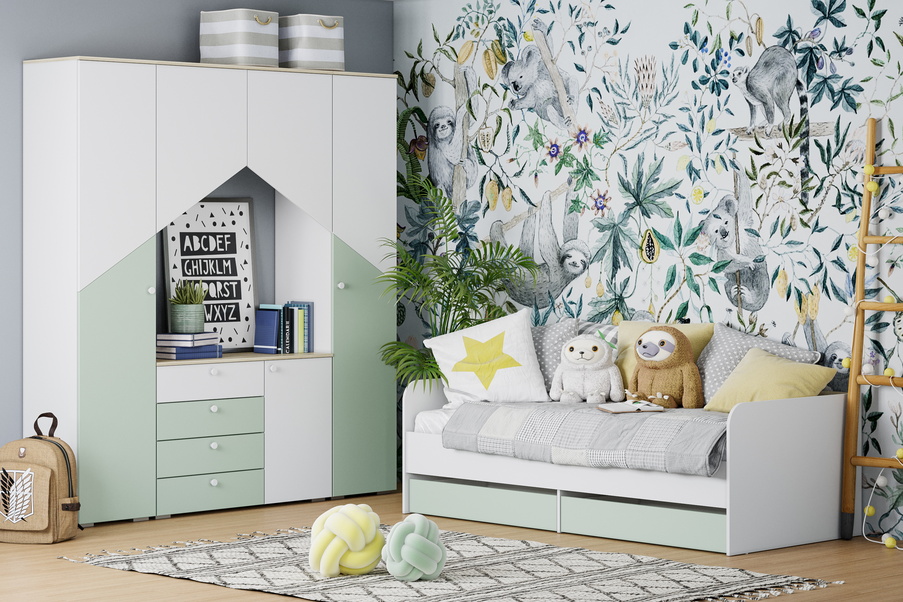 Особенности стиля детской «Банни» - это: светлые, спокойные оттенки в единой гамме. Скругленные ручки-кнопки не имеют острых граней. Ящики для хранения белья позволят навести порядок в комнате и расположить вещи. Скандинавская стилистика не любит загромождения мебелью. Только функциональность и практичность. Если правильно спланировать интерьер, в детской будет много места для хранения и пространства для игр. Фасады выполнены из МДФ с покрытием пленкой ПВХ.