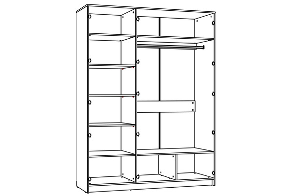 С комбинированным шкафом Livorno НМ 013.57 Х в спальне не придется устанавливать дополнительную мебель для хранения одежды. В левой части модуля находится секция с пятью полками для белья. Правую часть шкафа занимает отделение с овальной штангой, которая способна выдержать много тяжелой верхней одежды. Антресольная полка подходит для хранения объемных вещей, а нижняя полка – для размещения коробок с обувью. Зеркальный фасад расширяет функционал шкафа и увеличивает пространство комнаты.
