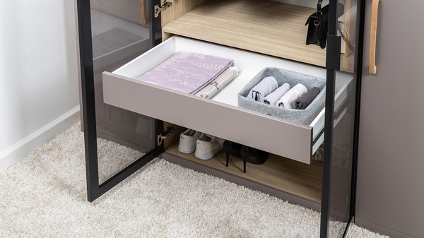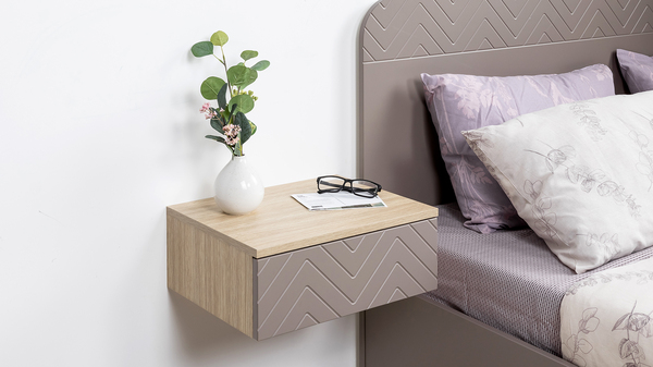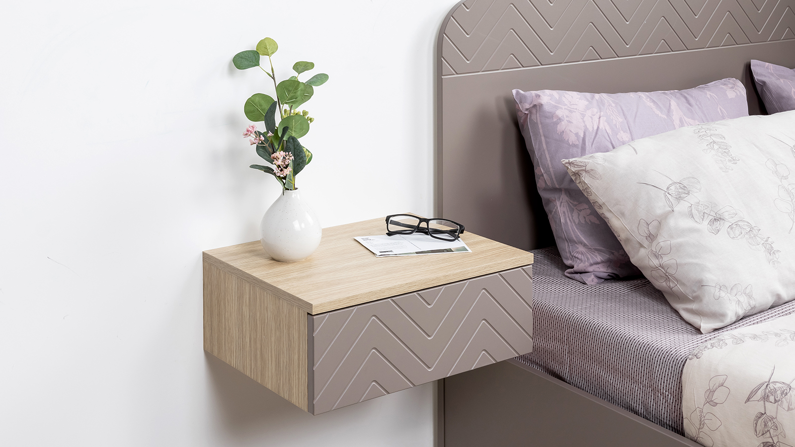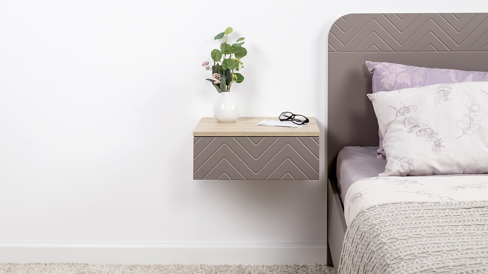 Подвесные консоли и велюровый пуф в тон фасадов дополняют сдержанный и благородный облик спальни Амьен.