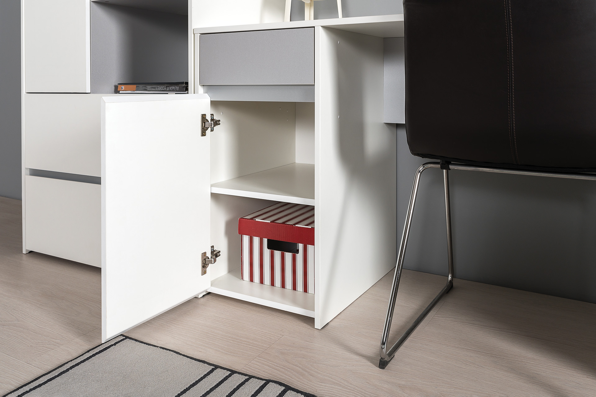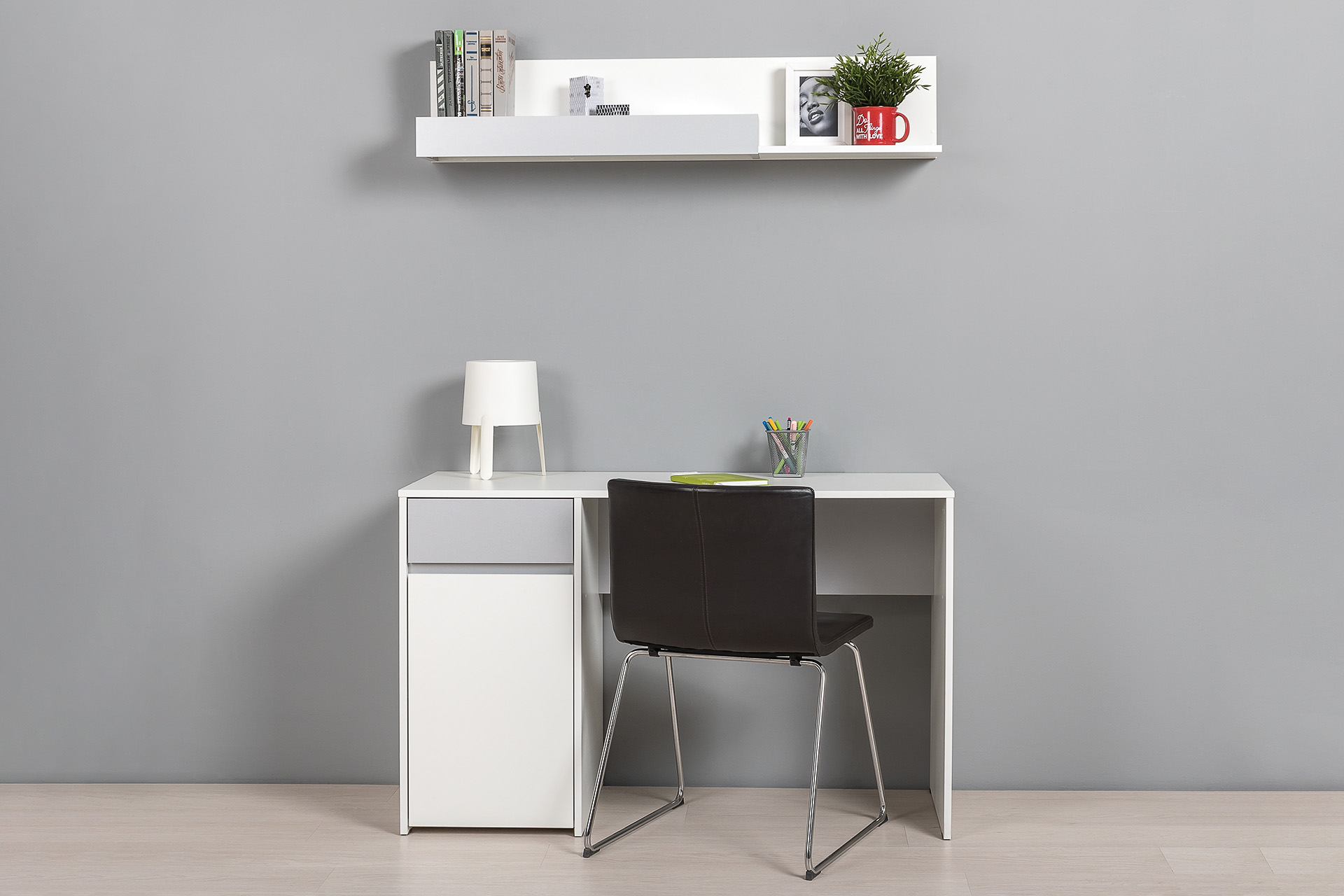 Базовый белый цвет, сочетаясь с акцентным серым, создаёт нейтральную основу для приятного интерьера, чтобы подчеркнуть личные вещи и аксессуары.