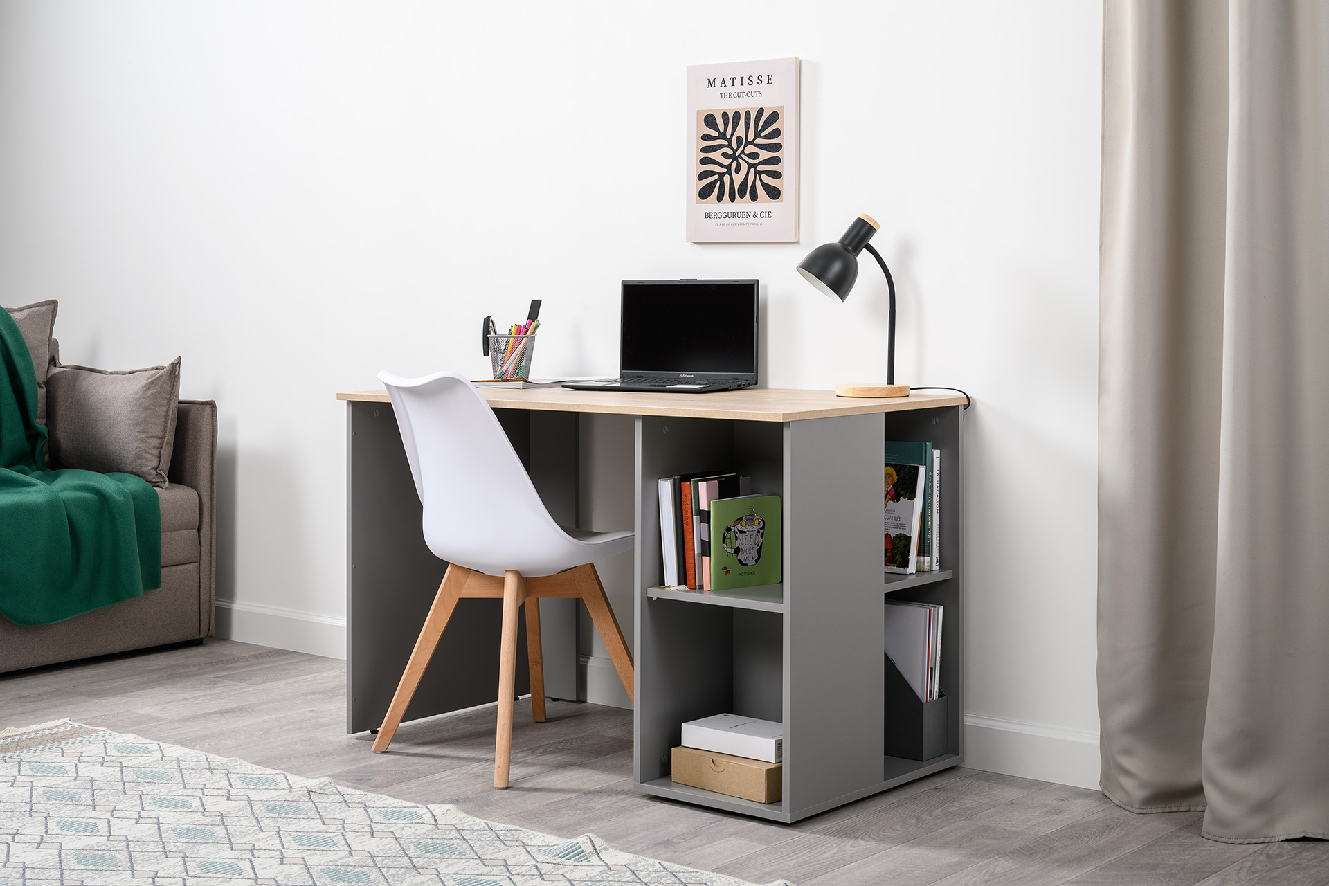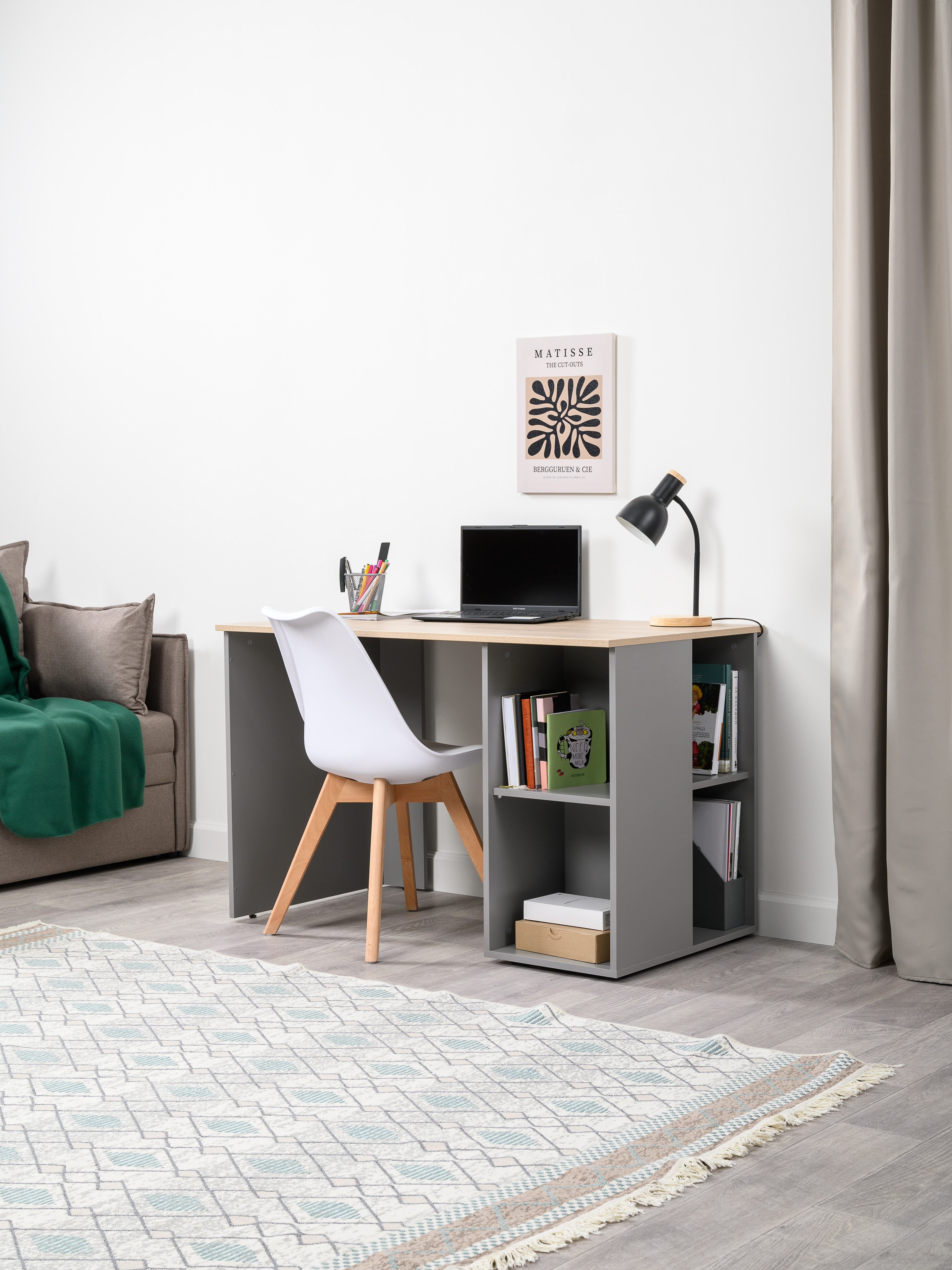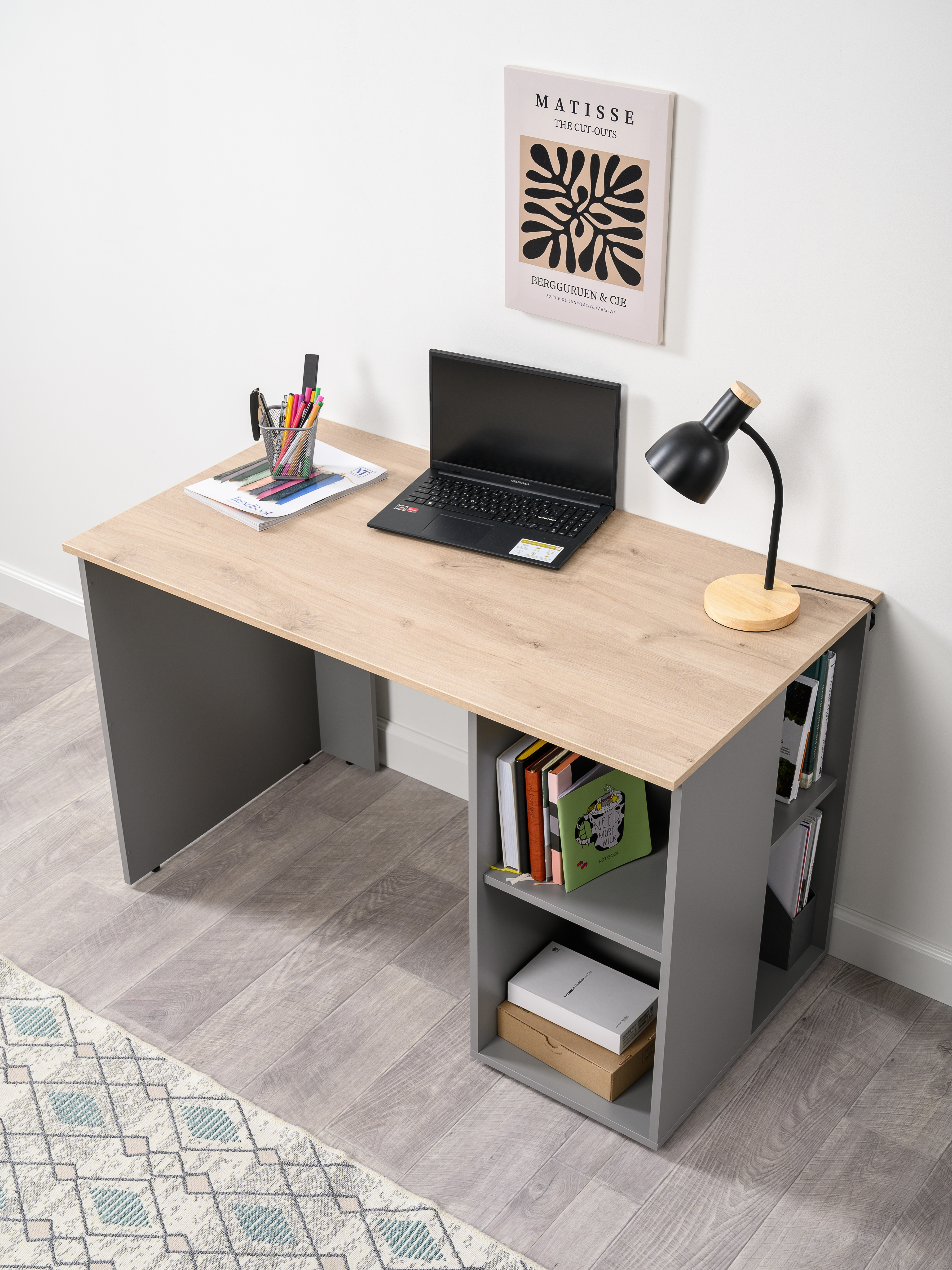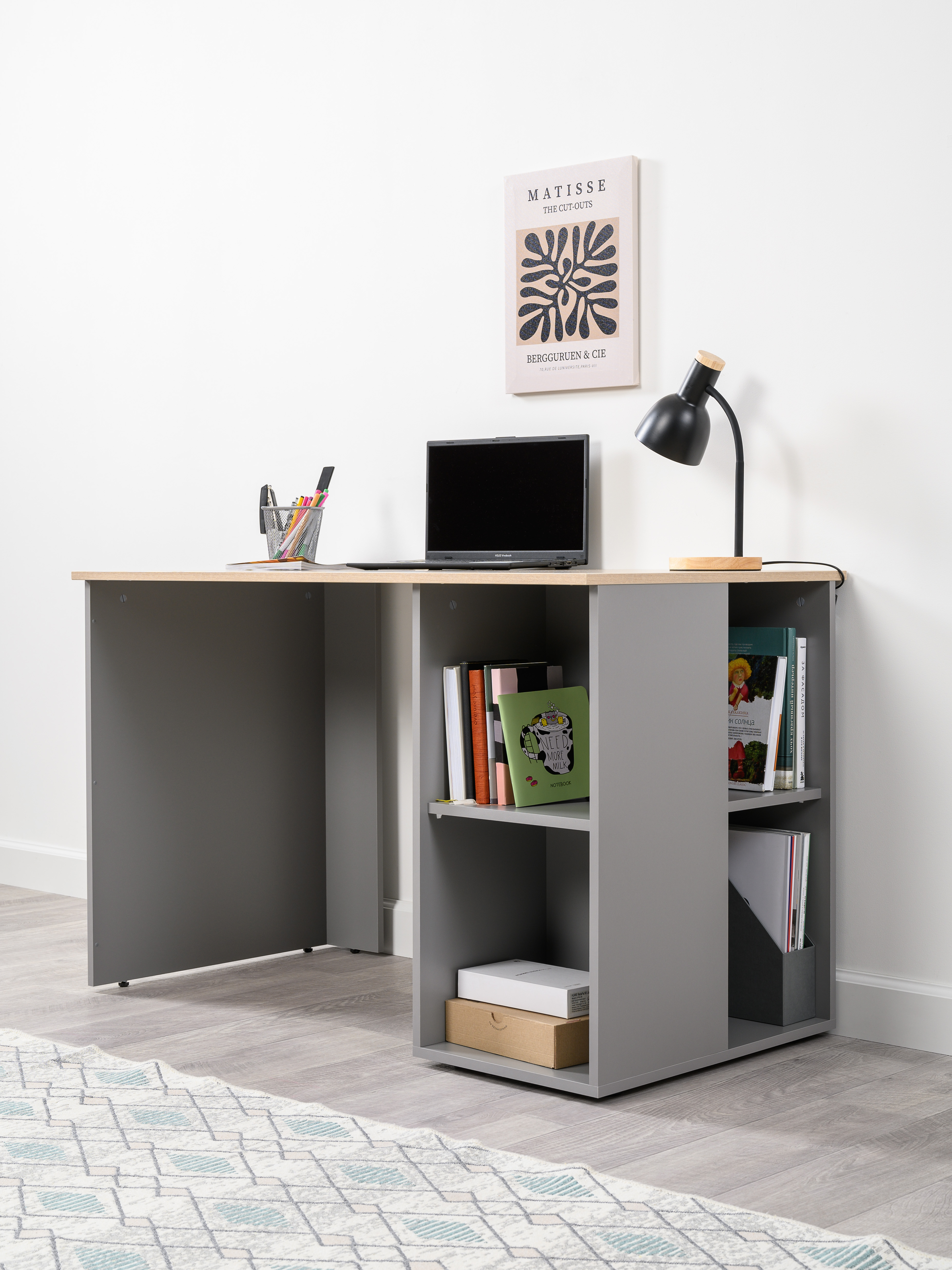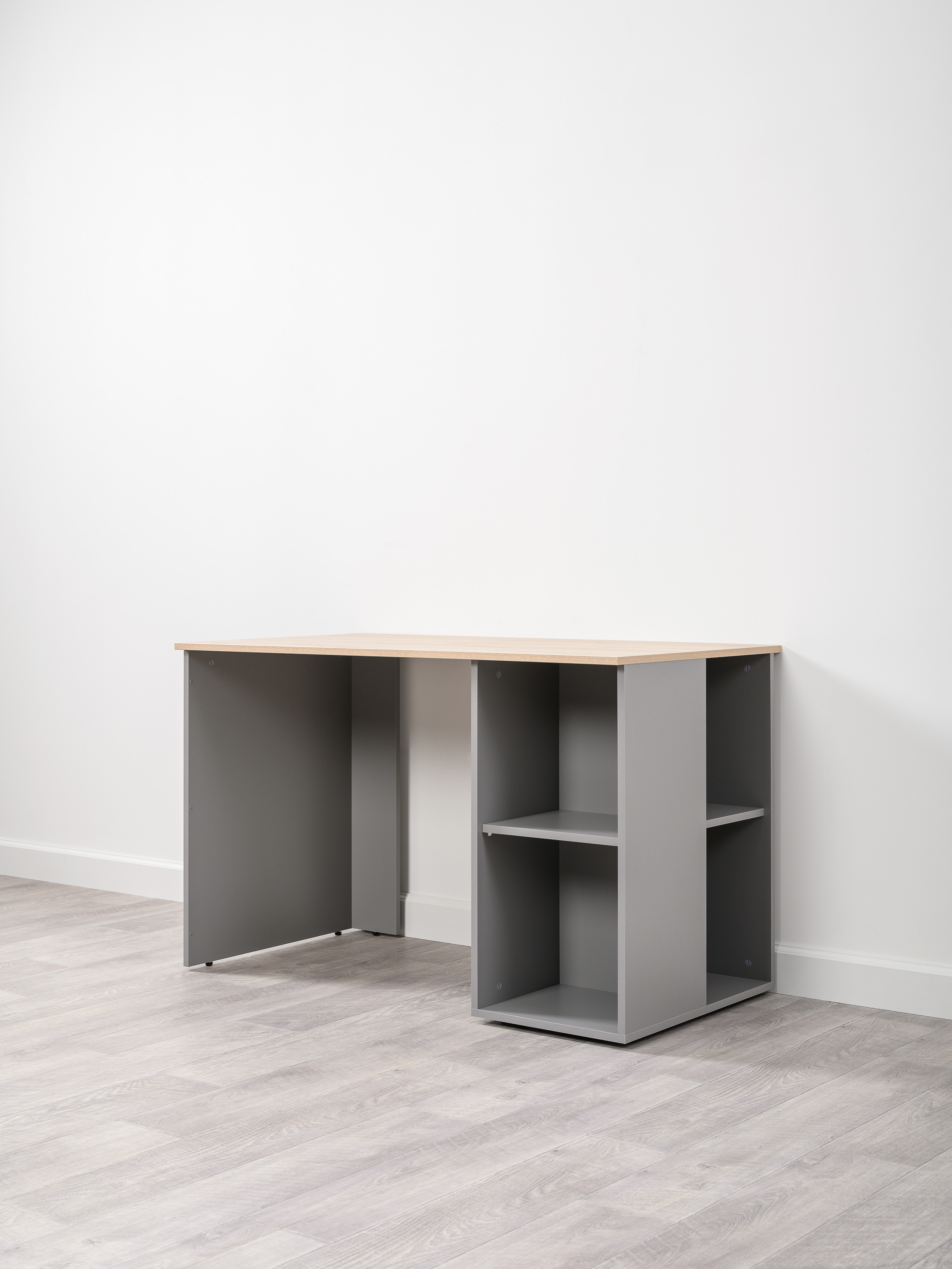 Стол письменный Лайт 12.163 серый шифер, дуб белый exclusive OW D4430, сборка на любую сторону, два варианта сборки тумбы
