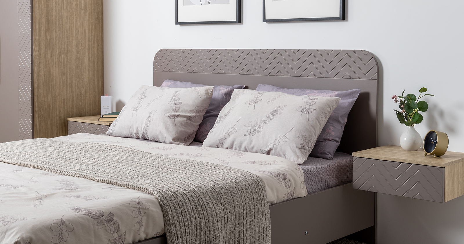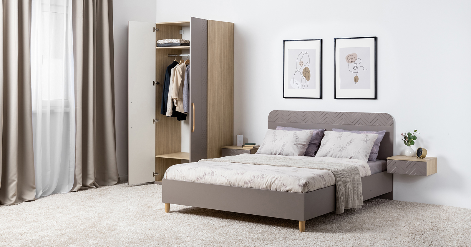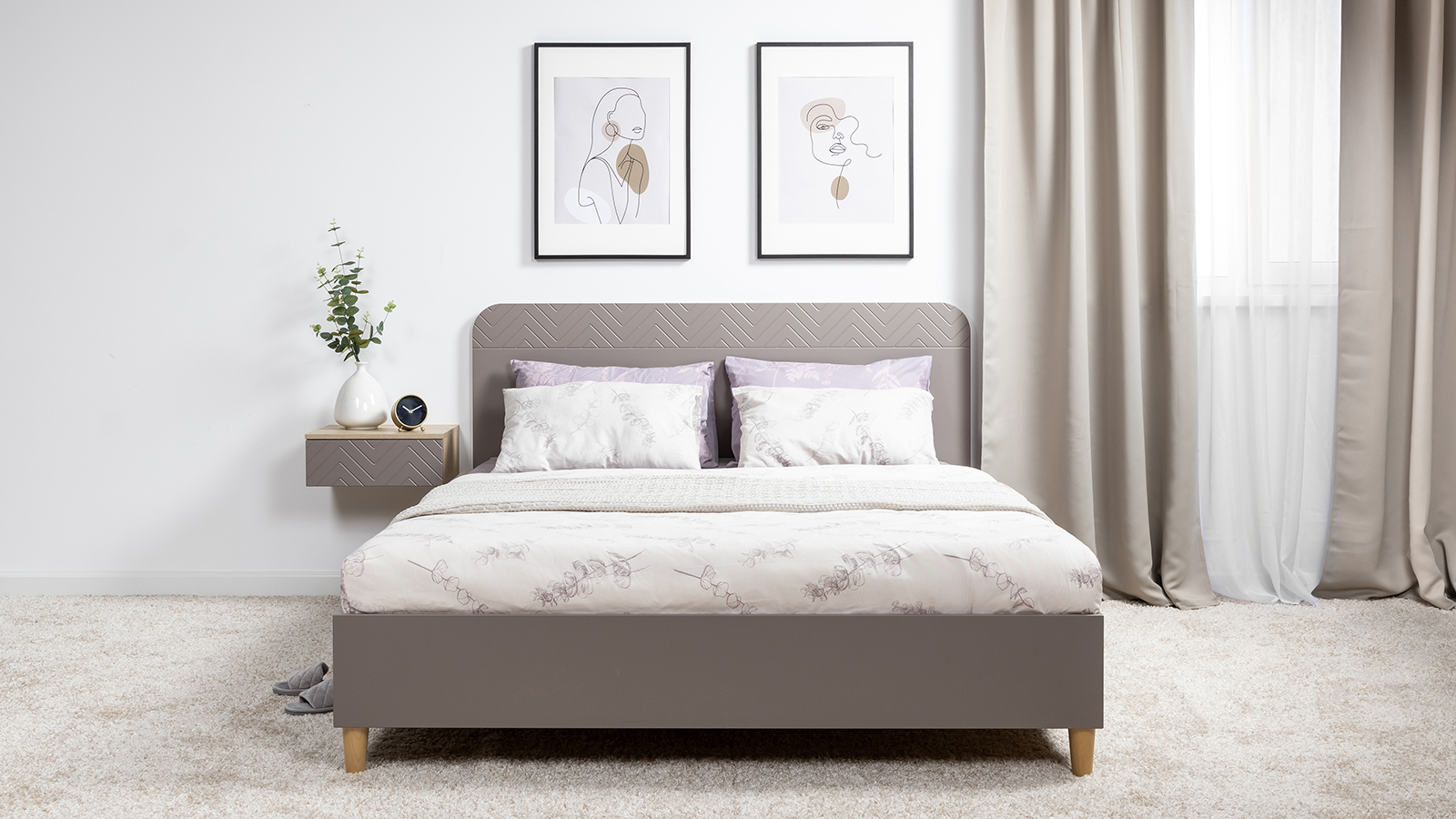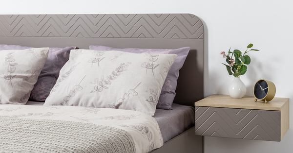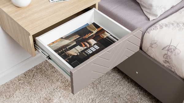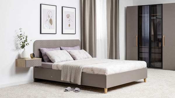 Подвесные консоли и велюровый пуф в тон фасадов дополняют сдержанный и благородный облик спальни Амьен.
