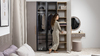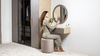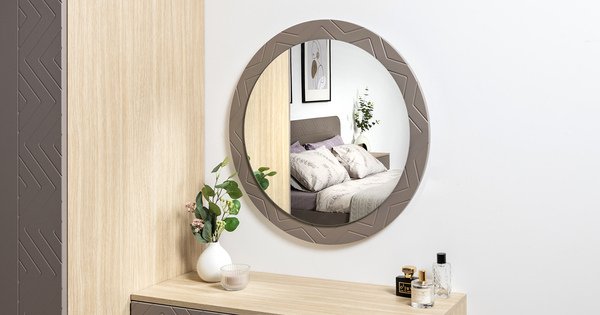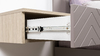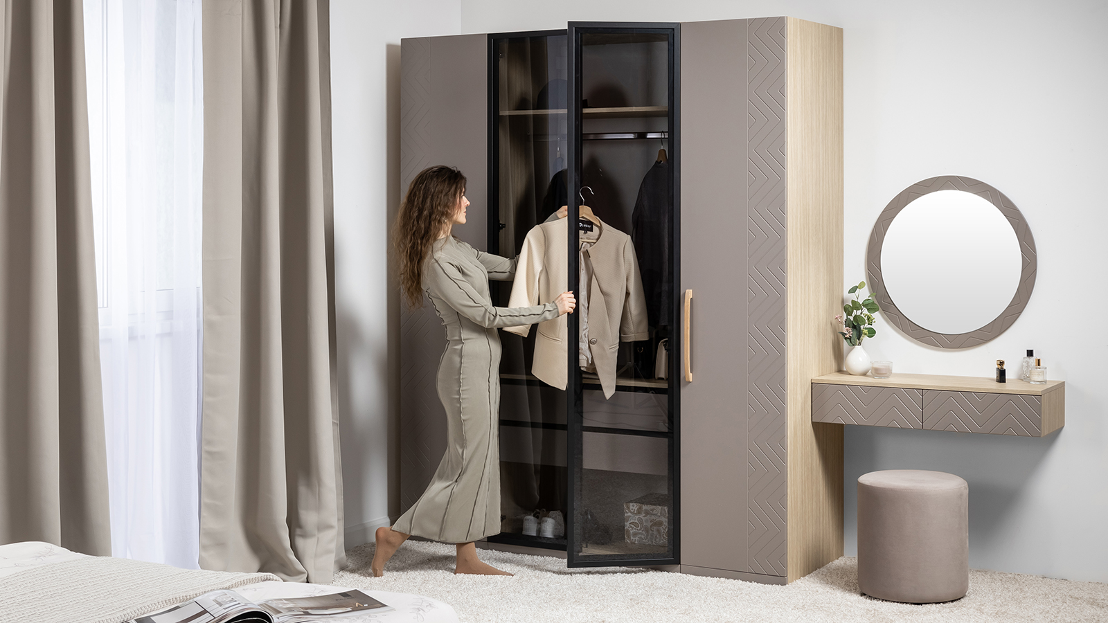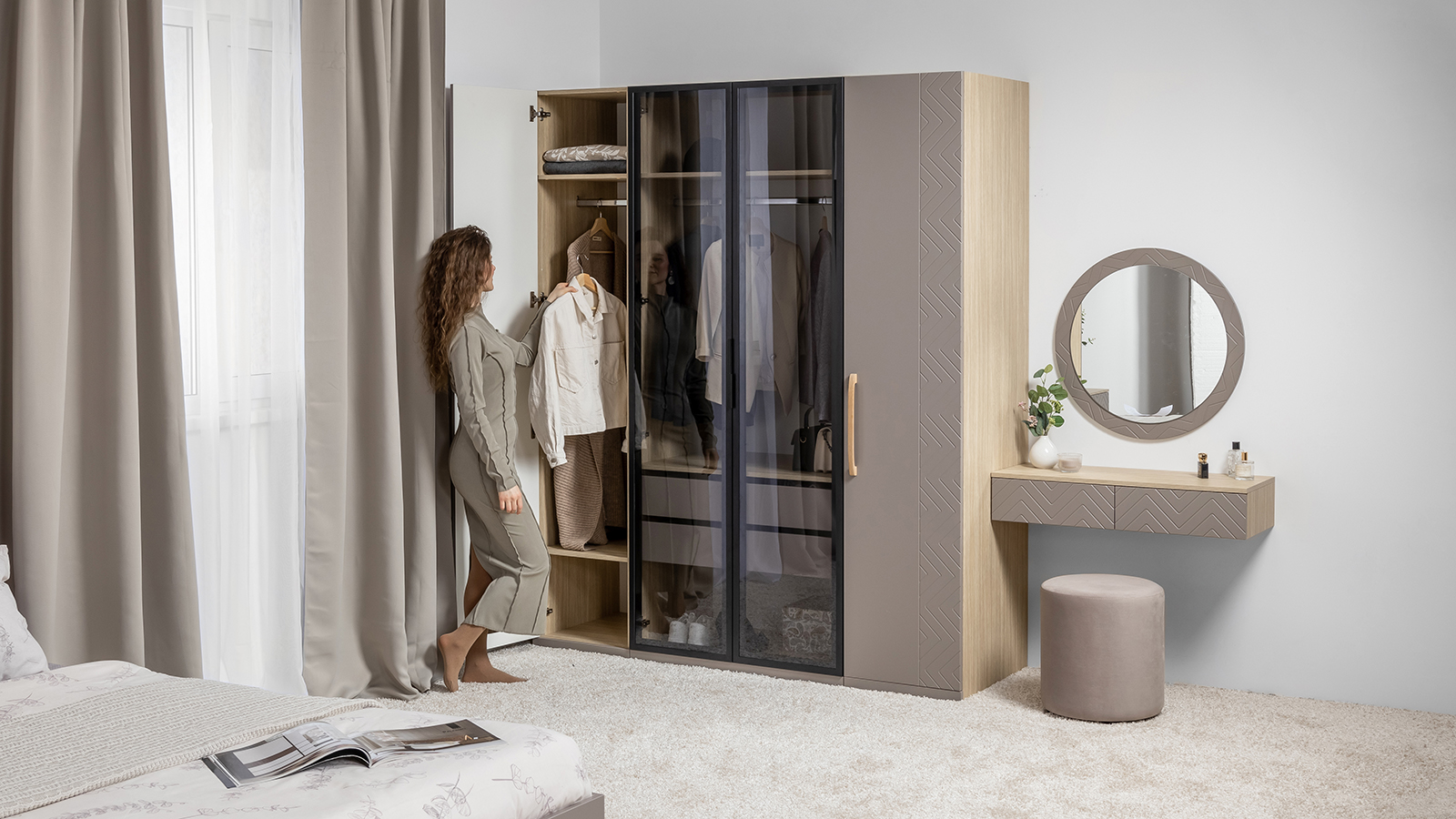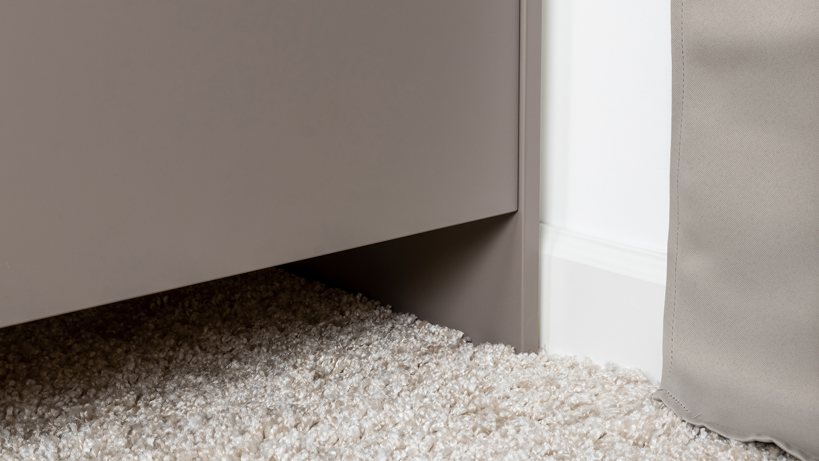 Подвесные консоли и велюровый пуф в тон фасадов дополняют сдержанный и благородный облик спальни Амьен.