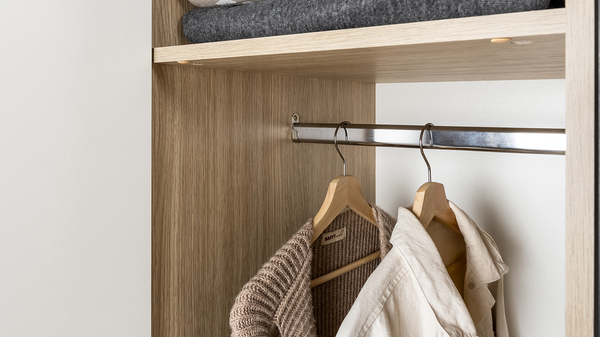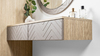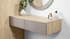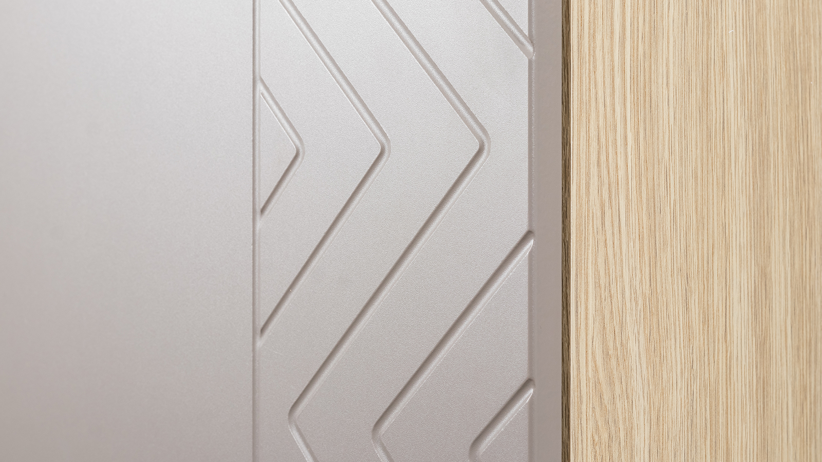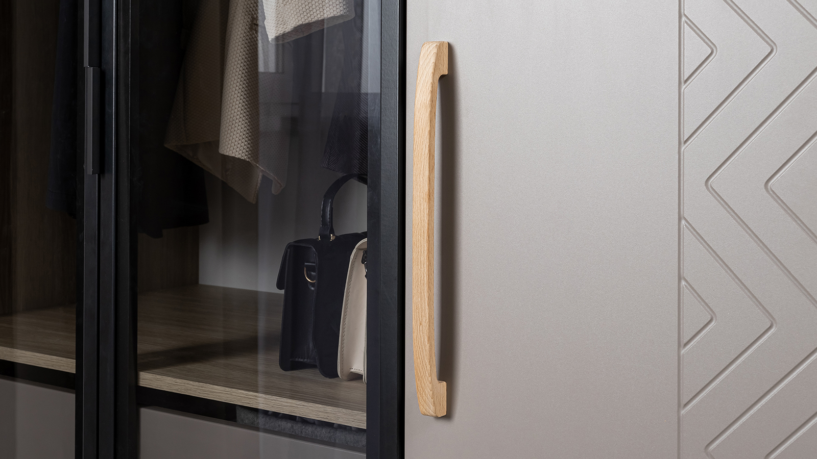 Фасады выполнены из МДФ с матовой поверхностью, изящная фрезеровка даёт визуальную лёгкость. Приглушённые натуральные цвета и чистые линии позволяют расслабиться и не фокусироваться на деталях интерьера. Лицевая фурнитура из натурального ясеня.