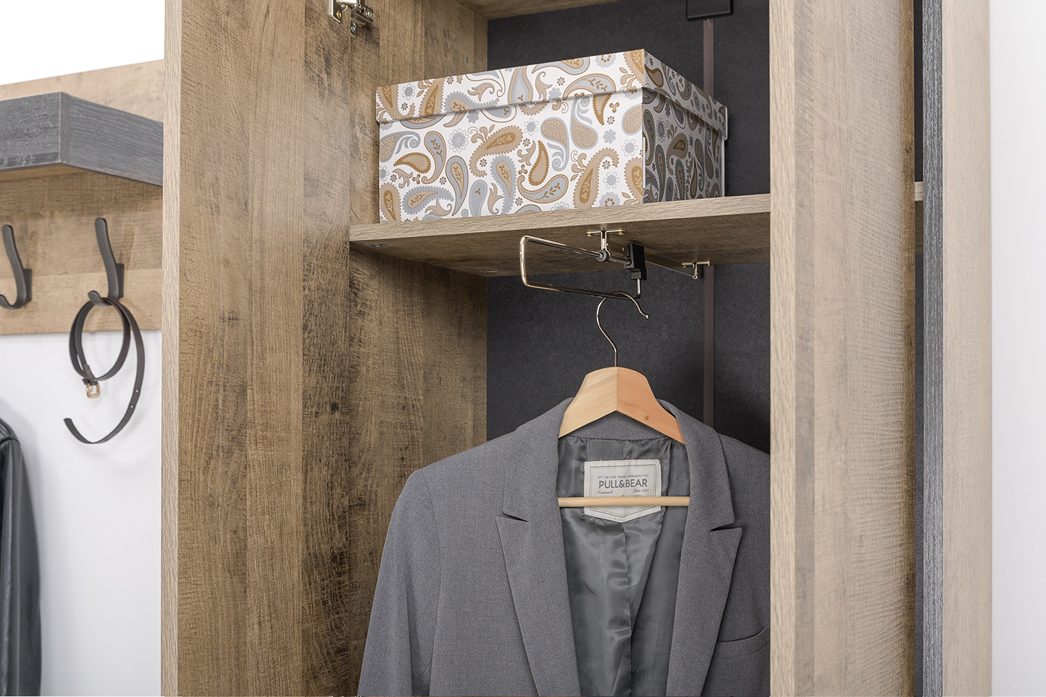 Лицевая фурнитура с тем же покрытием придаёт мебели индустриальную эстетику.