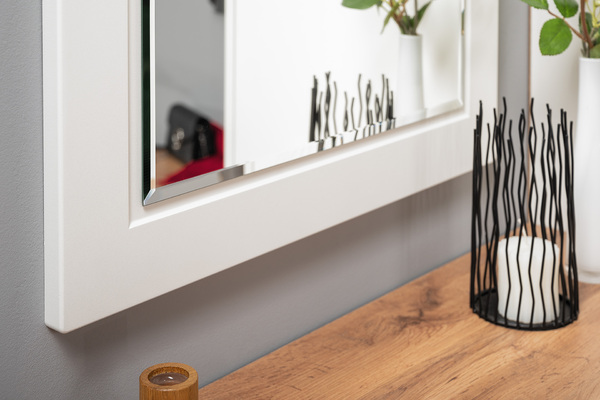 Зеркало "Остин" имеет вертикальное и горизонтальное навешивание. Фрезеровка на корпусе зеркала. Корпус зеркала МДФ 1,9 см с покрытием пленкой ПВХ, зеркало с фацетом 0,4 см, фацет на зеркале по периметру шириной 1 см, регулировка уровня угла установки зеркала с помощью центровочных втулок (в комплекте 2 шт.), зеркало устанавливается на панель из МДФ с помощью двухстороннего скотка (в комплекте) и для надежности фиксации с помощью силиконового герметика.